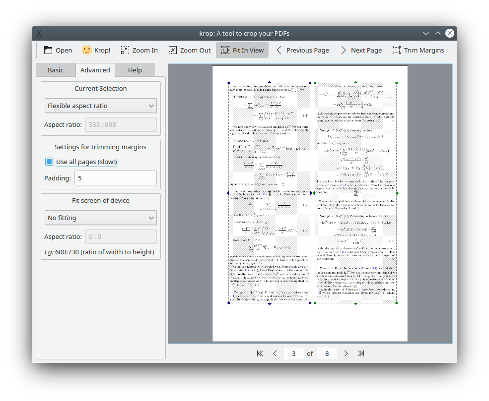 This is how krop looks after opening a PDF file and selecting a region. In fact, the selection you see here was automatically created by simply pressing Trim Margins.