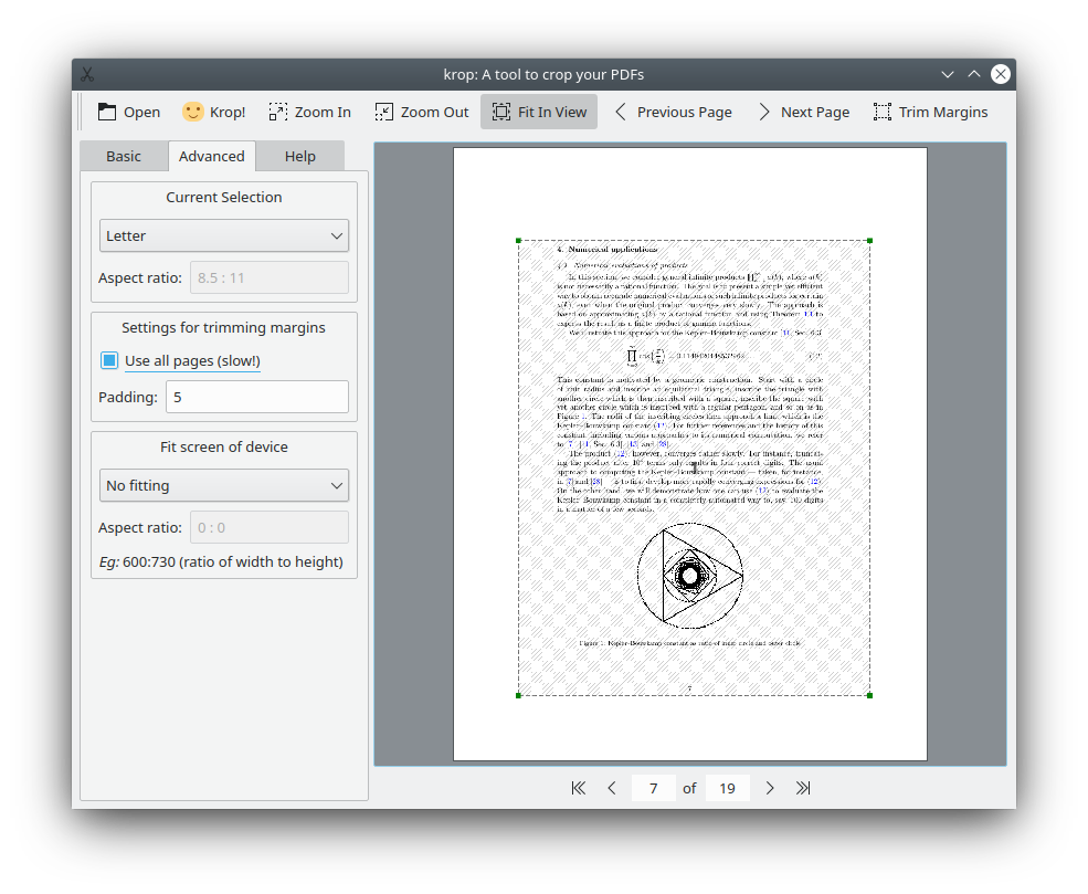 This is how krop looks after opening a PDF file and selecting a region. In fact, the selection you see here was automatically created by simply pressing Trim Margins.